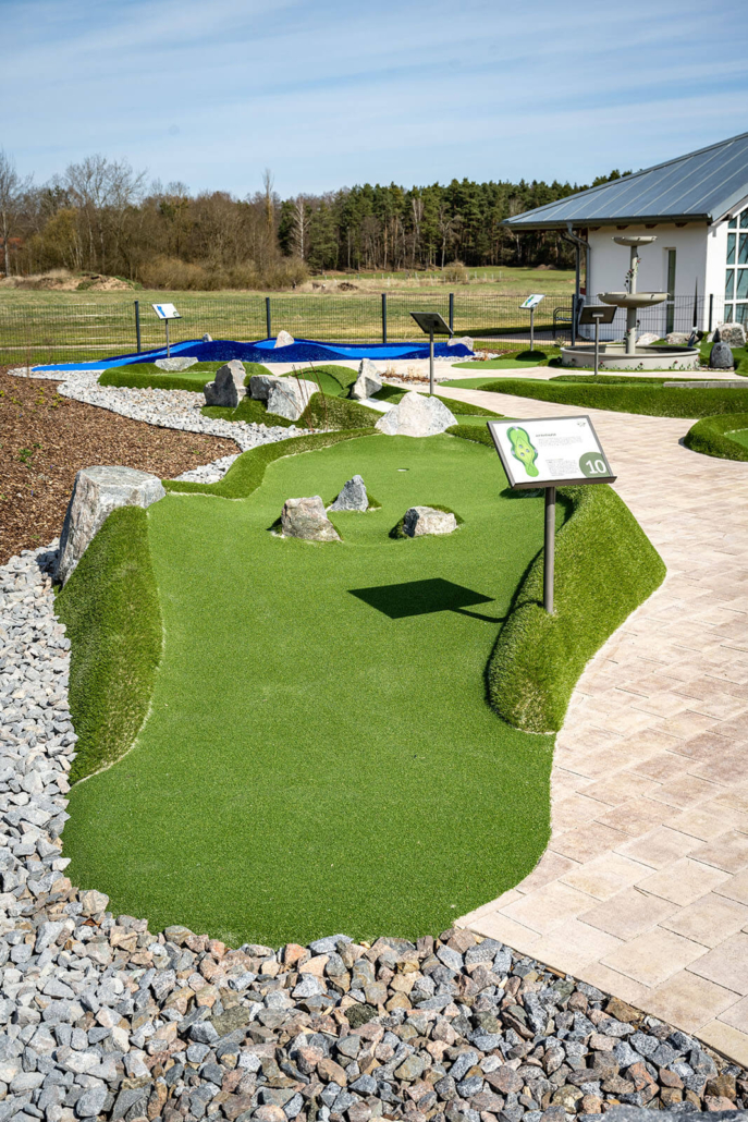 Diese Bahn führt dich direkt auf ein ganz besonderes Flugzeug zu: die Cri-Cri, hier in Originalgröße ausgestellt. Sie gilt als das kleinste zweimotorige Flugzeug der Welt – und genauso wendig fühlt sich auch die Bahn an. Der Weg schlängelt sich in leichten Kurven nach vorne, vorbei an Felssteinen und über dunklere Beläge, die den Eindruck einer kleinen Start- oder Rollfläche vermitteln. Wer seinen Ball kontrolliert führt, erreicht das Loch genau dort, wo die Cri-Cri scheinbar zum Abheben ansetzt. Eine Bahn, die zeigt, wie viel Freude in etwas ganz Kleinem stecken kann.